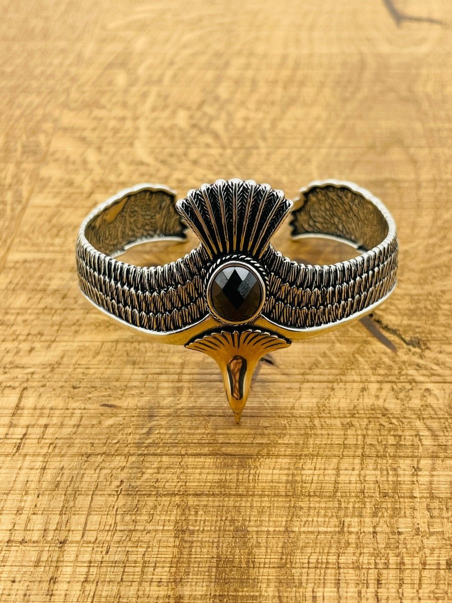 ارفع مستوى أناقتك مع هذا السوار الفضي القابل للتعديل للرجال بتصميم النسر المذهل. مصنوع يدويًا بدقة، يتميز هذا السوار بتصميم حيواني متقن وحجر زركون أسود لافت، مما يجعله قطعة مجوهرات رائعة.