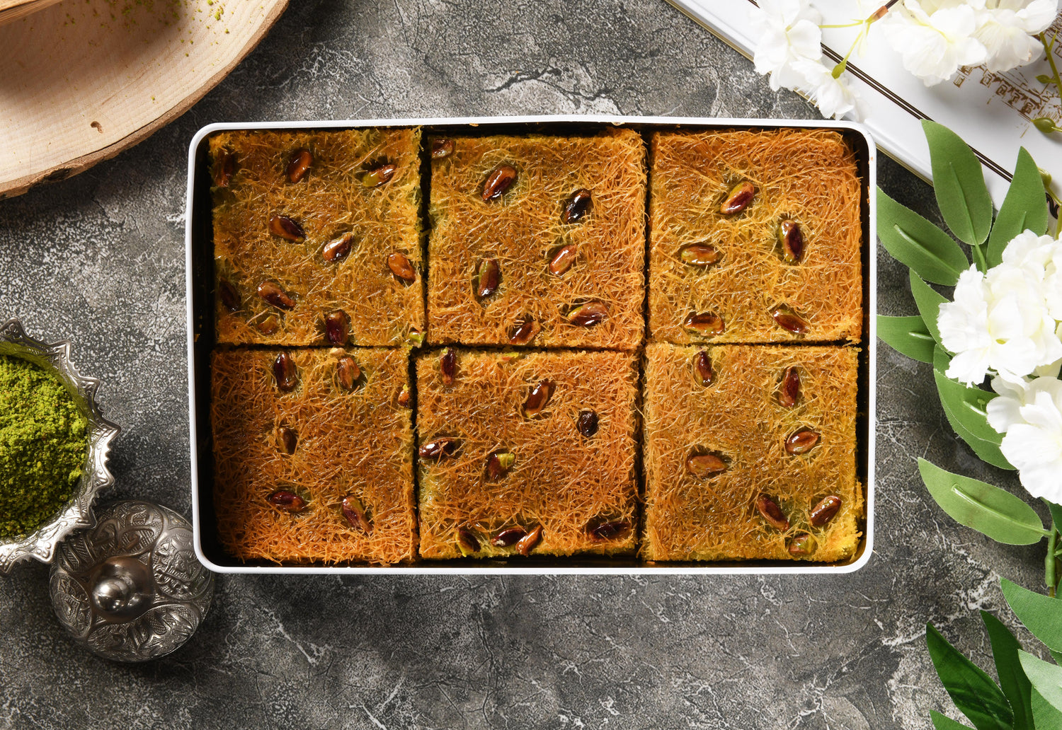 كنافة الفستق هي حلوى تركية لذيذة تُصنع عن طريق تغليف الفستق داخل طبقات من الكنافة الرفيعة. تُعد بعناية ودقة، وتعد هذه الحلوى بإثارة براعم التذوق لديك بنكهتها الغنية وملمسها الذي لا يقاوم.
