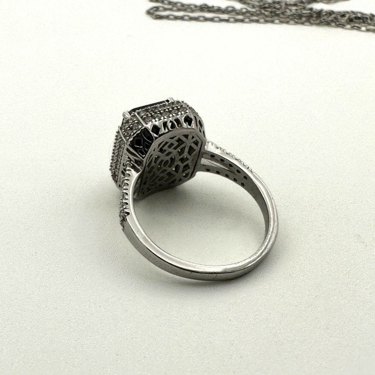 أضف لمسة من الأناقة إلى مجموعتك مع طقم المجوهرات الفضي بحجر العقيق الأسود الرائع. سواء كهدية لأحد الأحباء أو كإكسسوار شخصي، فإن هذا الطقم سيأسر القلوب ويلهم.