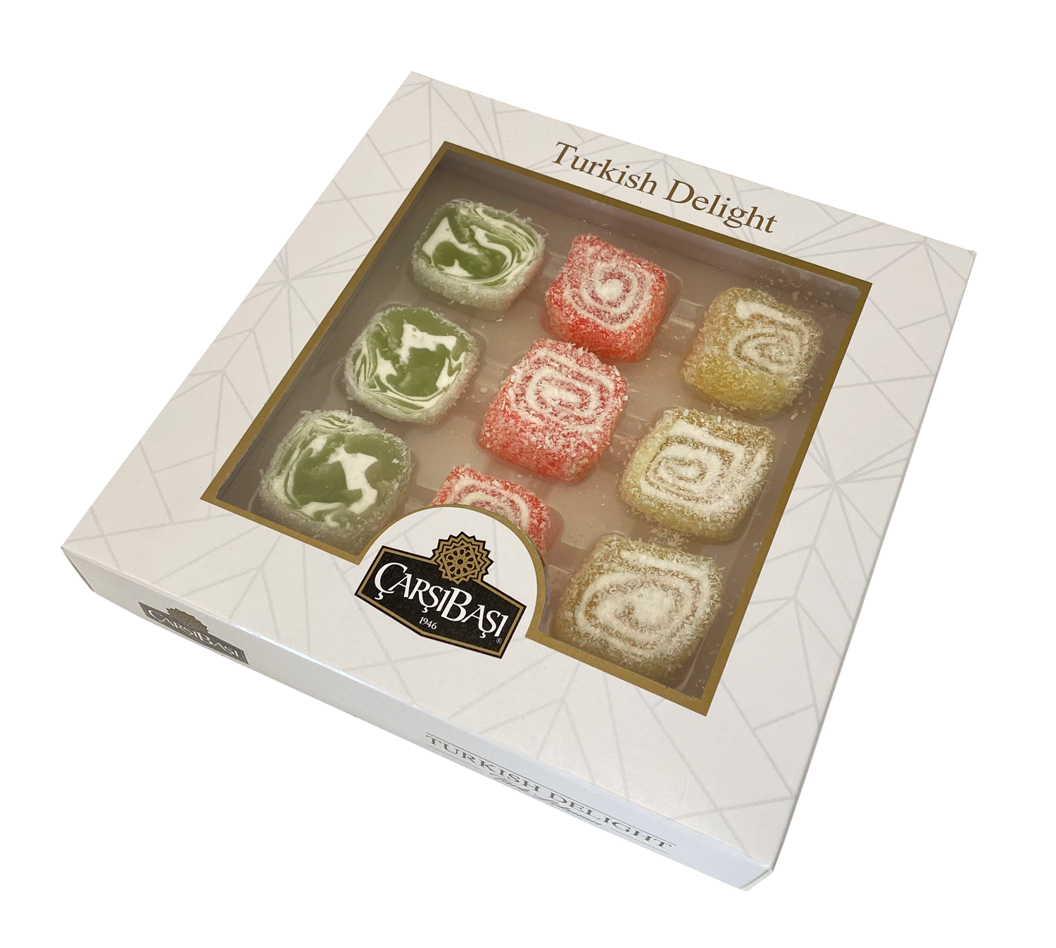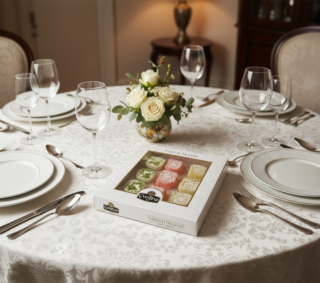 هذه ليست حلوى لوكوم عادية. كل قطعة هي حلوى على طراز 'سرما' — جيلي ناعم بنكهة الفاكهة ملفوف حول مركز كريمي ناعم. تحتوي هذه المجموعة على ثلاث نكهات حيوية، من المحتمل أن تكون تفاح أخضر/كيوي، فراولة حمراء/رمان، وليمون أصفر/برتقال، كلها مرشوشة بخفة لإضفاء لمسة نهائية مثالية.
