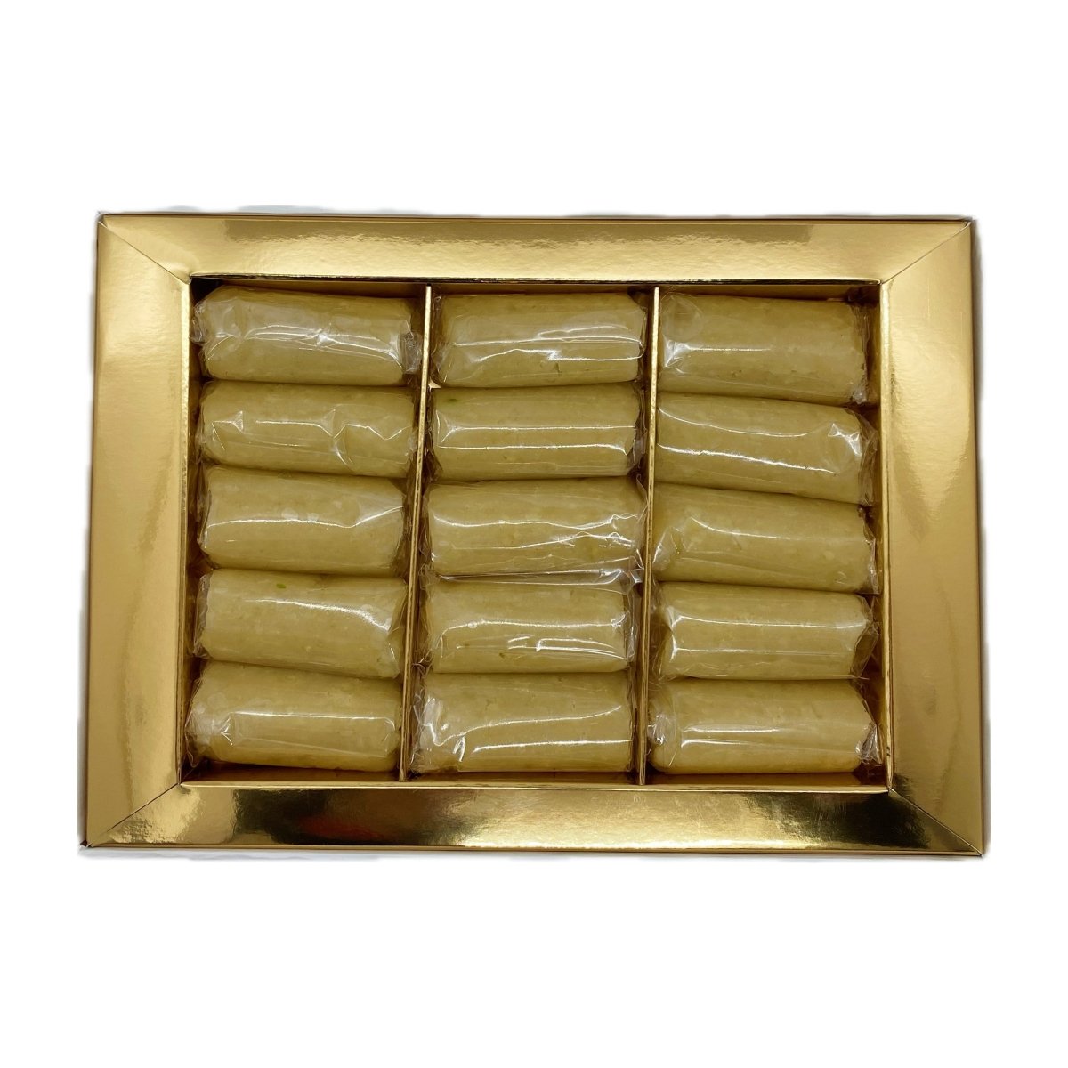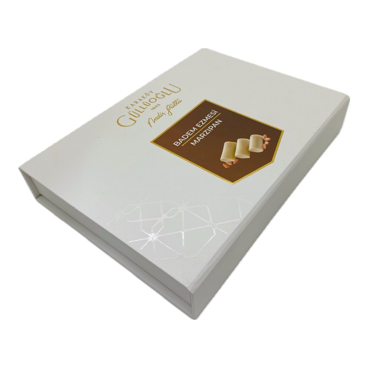 Karakoy Gulluoglu يقدم نسخته اللذيذة من المارزيبان. يتم صنعه يدويًا باستخدام اللوز المطحون ناعماً، السكر، والماء، ثم يُمزج لخلق القوام المثالي قبل الطهي. غالبًا ما يُستمتع بالمارزيبان مع الكعك، الحلويات، أو حتى بمفرده مع فنجان من القهوة أو الشاي. أيًا كان تفضيلك، استعد لتجربة استيقاظ لذيذ لحواسك مع هذه الحلوى الحلوة والمكسراتية.
