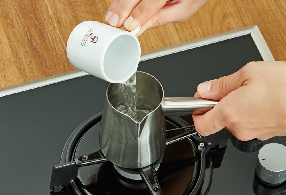 استخدم 5-6 جرامات (1.5 ملعقة صغيرة) من القهوة لكل 65 مل من الماء. أضف الماء إلى القدر واضبطه على حرارة منخفضة. أضف القهوة والكمية التي تختارها من السكر إلى الماء وامزجهم ببطء. بمجرد أن يأتي القهوة إلى فقاعات بمرور الوقت، صب الرغوة في كوبك (أكوابك). ثم اغلي القهوة المتبقية أكثر، وصب الباقي في كوبك (أكوابك).